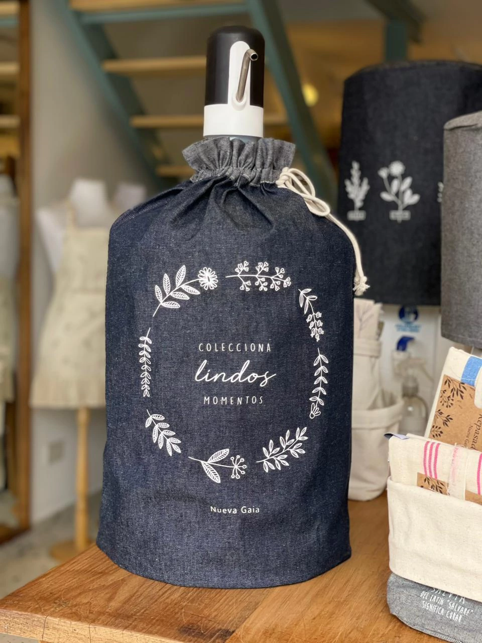 Funda para bidón de agua confeccionada en gabardina gris, ideal para el modelo que usa la bomba USB en la parte superior. Tiene tiras regulables que permiten un ajuste perfecto y se ata tipo moño, dándole un toque canchero y práctico. Medida aproximada: 50 cm de alto x 44 cm de ancho.